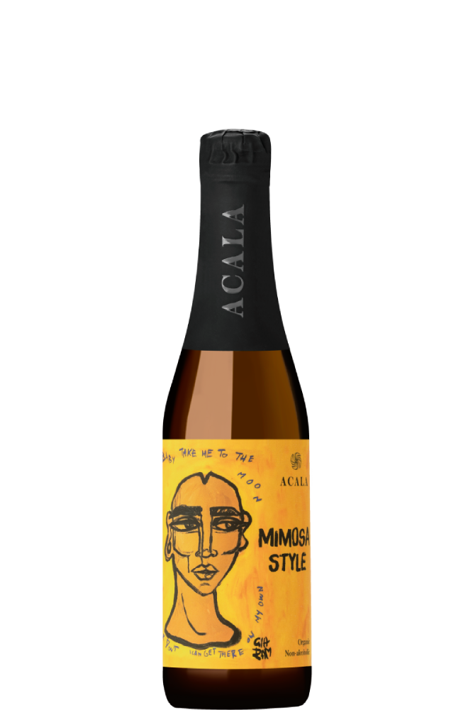 Acala Sparkling Tea Mimosa – Frisk citrus möter solmogna frukter. Ett plus för den galet snygga etiketten. Målad av en konstnärinna i Litauen.